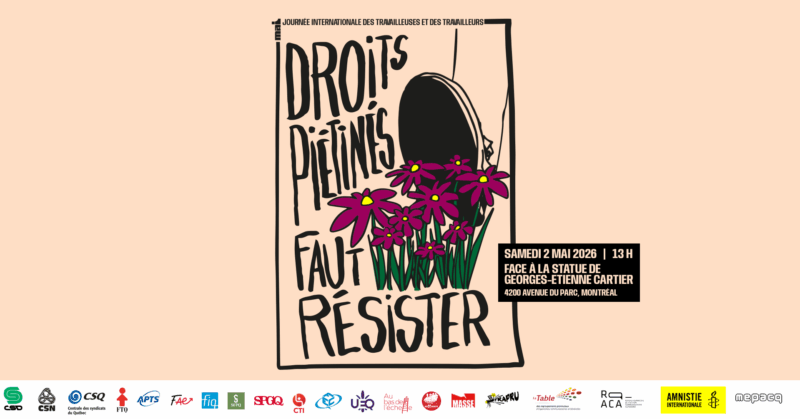 Les atteintes aux droits fondamentaux se multiplient. Lois antisyndicales, moins de services, plus de pression et des conditions qui se dégradent : ce sont des choix politiques. Il faut s’unir pour marcher afin de dénoncer les attaques répétées de la CAQ contre les travailleuses et les travailleurs! On piétine nos droits : il faut résister!