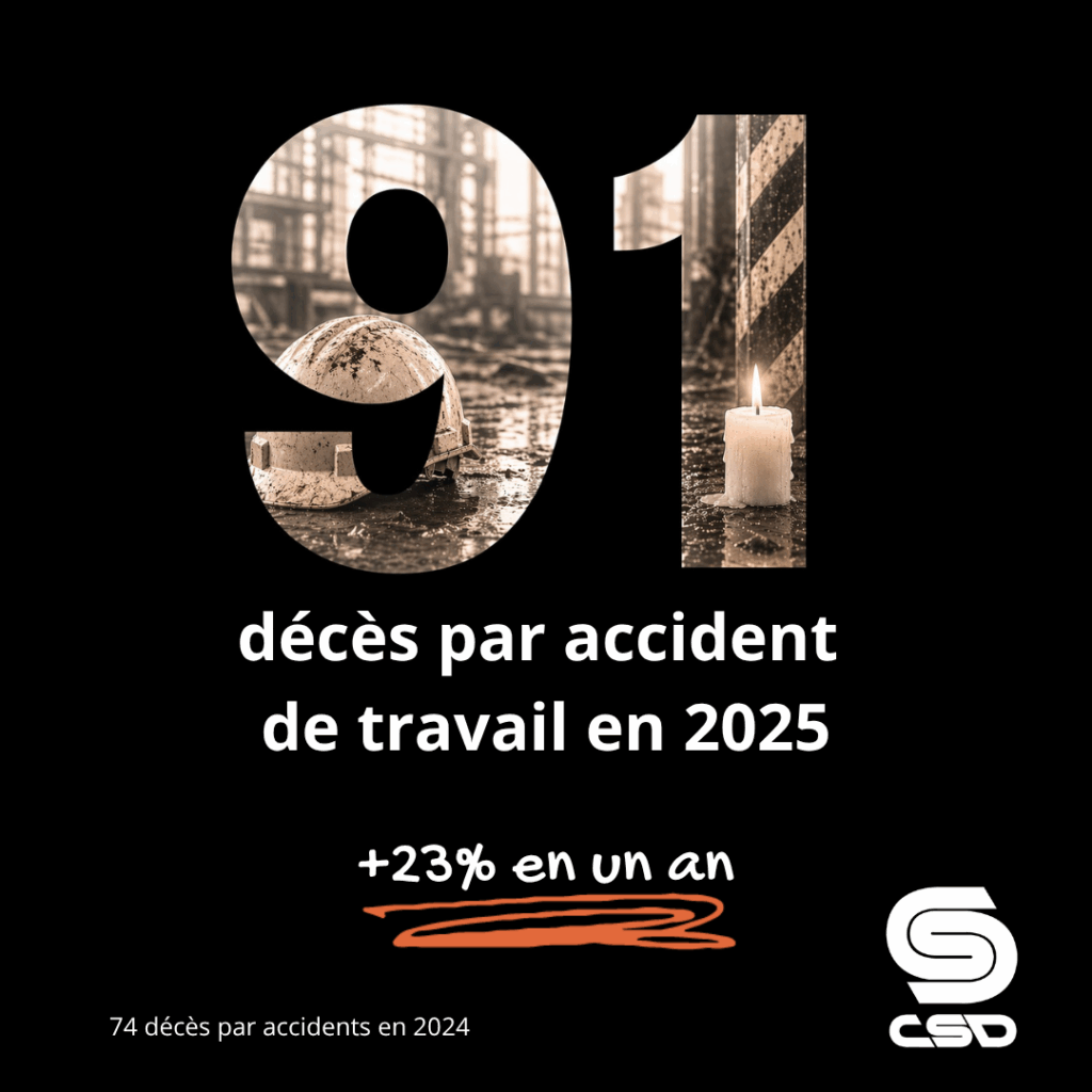 La CSD juge particulièrement préoccupante la hausse du nombre de décès liés au travail. En 2025, le nombre total de décès passe de 246 à 257. Il s’agit du pire bilan observé depuis au moins 2002. Surtout, cette hausse s’explique par une forte progression des décès causés par un accident du travail, qui passent de 74 à 91, soit une augmentation de 23 %.