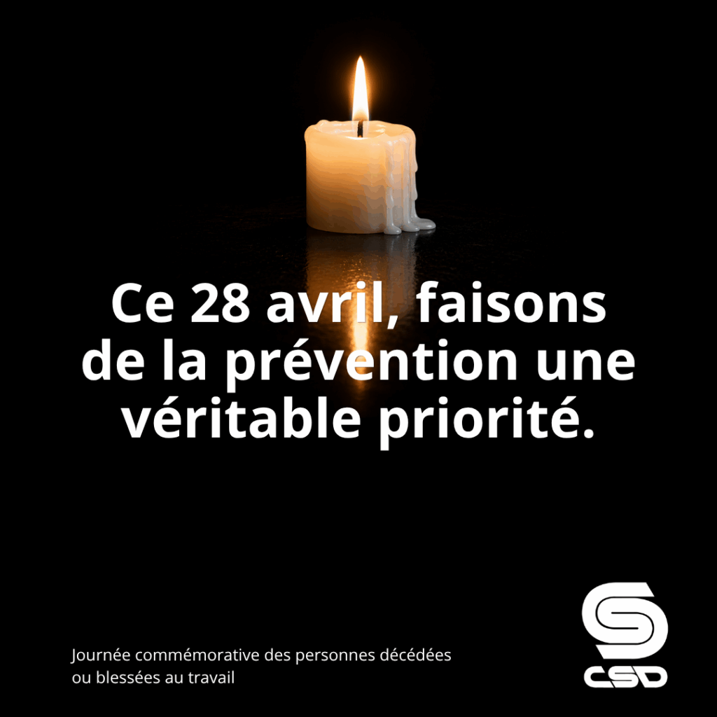 À l’occasion de la Journée commémorative des personnes décédées ou blessées au travail, la Centrale des syndicats démocratiques (CSD) dresse un constat sévère : cinq ans après l’adoption du projet de loi 59, devenu la Loi modernisant le régime de santé et de sécurité du travail, la réforme n’a pas permis, sans surprise, le virage nécessaire en prévention.