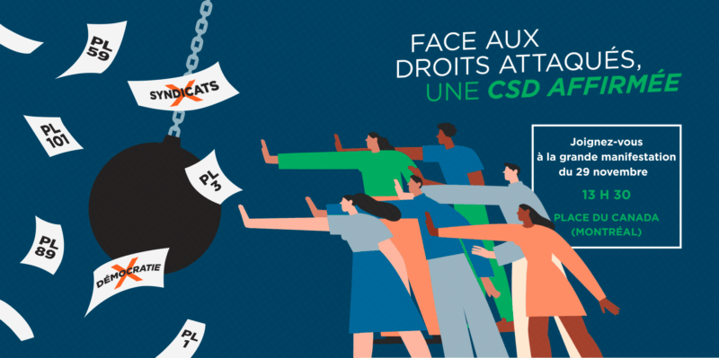 Le 29 novembre, soyons nombreux et nombreuses à marcher ensemble à Montréal! Un grand rassemblement intersyndical aura lieu pour dire non aux attaques antisyndicales, aux compressions budgétaires et aux reculs de nos droits. 📍 Départ : Place du Canada (Montréal)🕐 Heure : 13 h 30➡️ Marche vers les bureaux du ministre du Travail et du